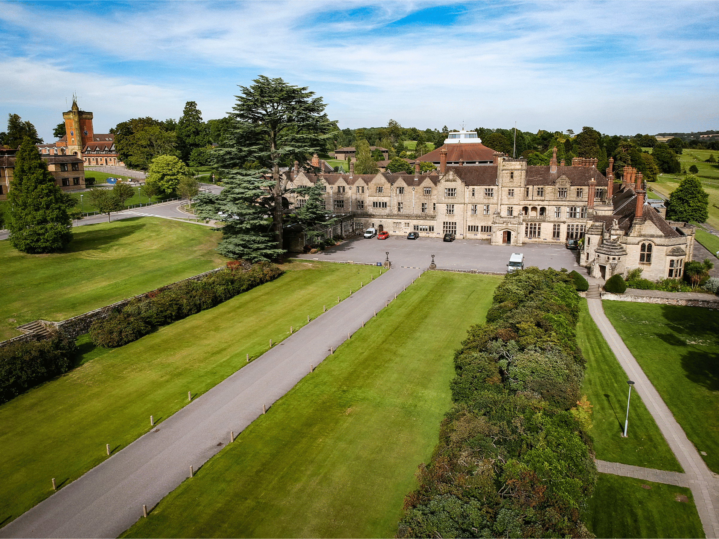 View of the front of Worth Abbey with a driveway leading up to it, surrounded by an open front field